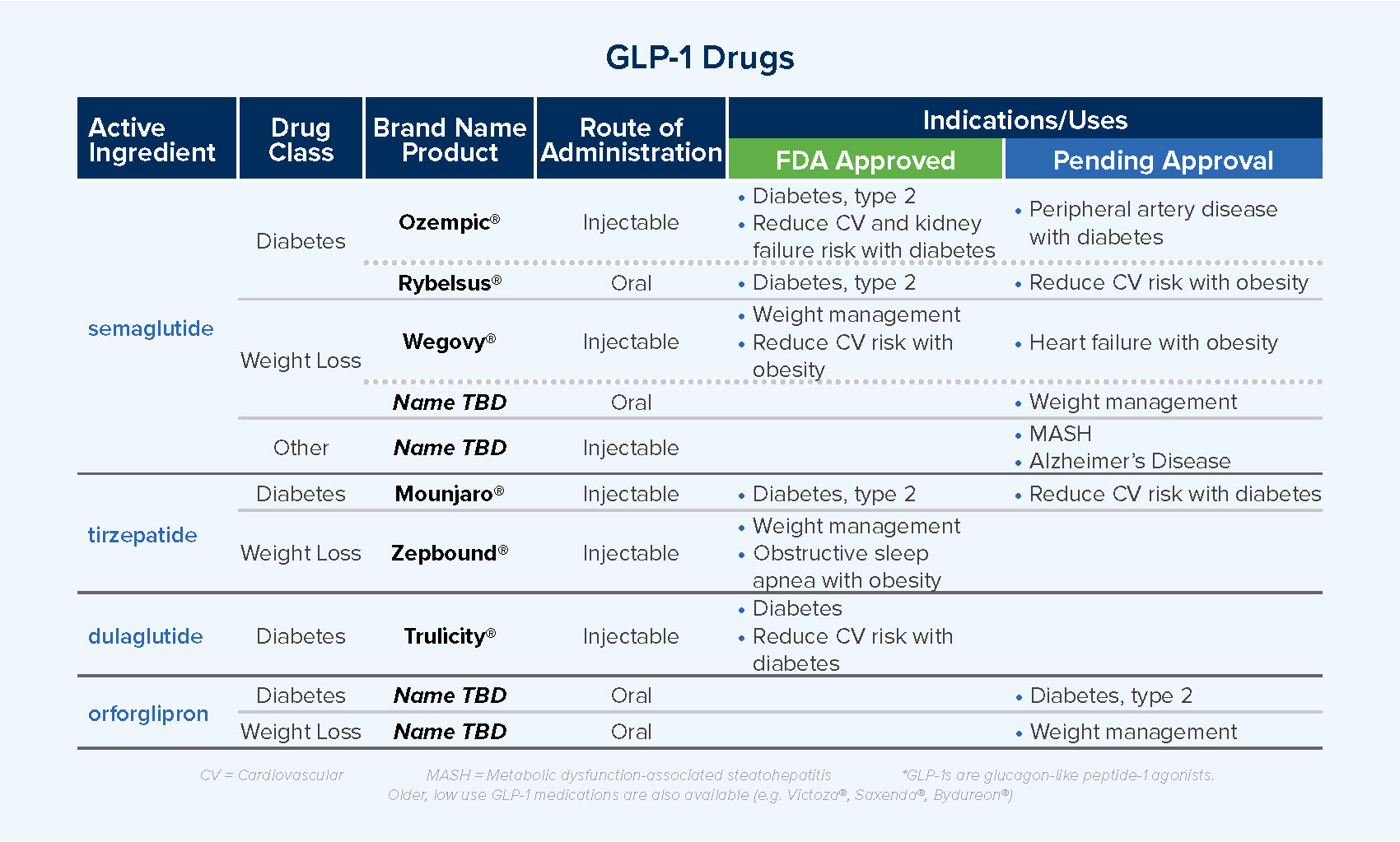 - Near-term approvals are expected for oral semaglutide for weight management and for injectable semaglutide for heart failure with obesity as well as metabolic dysfunction-associated steatohepatitis (MASH), a form of liver disease.