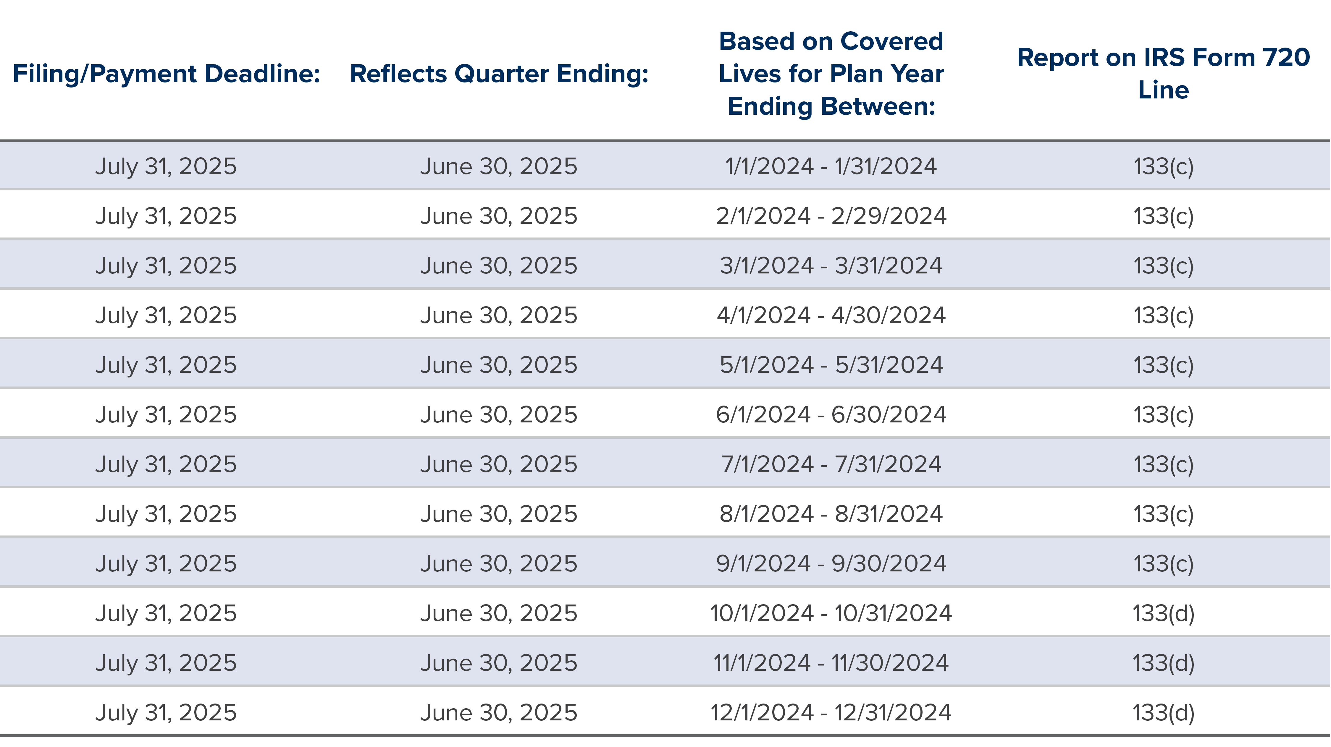 The chart, below, reflects the correct information to report on Form 720 for plan years ending in 2024, for reference: